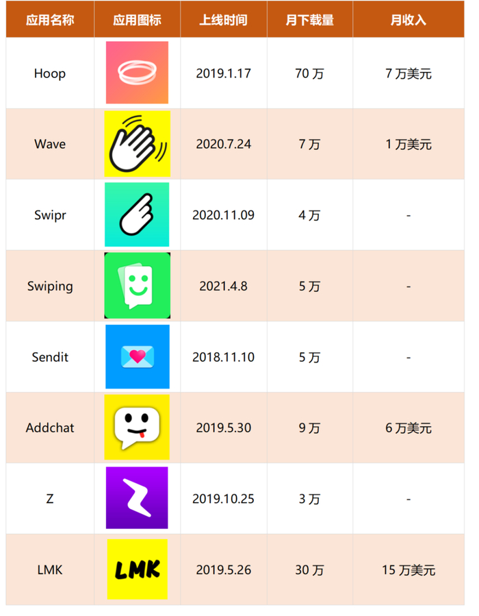 下面我们选取 8 款应用中成绩最好的 LMK、Hoop 和 Addchat 来详细分析一下。其实这 3 款 App 也大致可以按照结果来分成 2 类,一类是始终围绕 Snapchat 做工具类功能的 Hoop 和 Addchat,另一类是生于 Snapchat,但已经独立的“成年 App”,后者如这篇文章在分析的 LMK、以及之前笔者曾经写过的 Yubo,Yubo 这款最初也是被用户作为找 Snapchat 好友的工具 App,2021 年 3 月的全球月流水已经做到 320 万美金了。