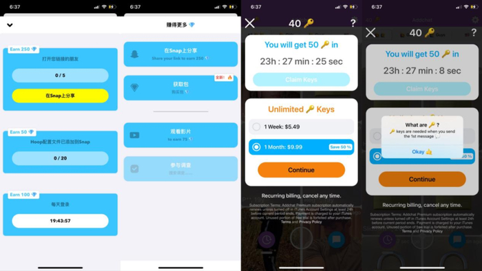 Hoop 限制用户无限制滑动的方法也有一些类似,用户每请求添加对方好友一次会消耗 10 颗钻石、点击不喜欢不会消耗钻石。用户获得钻石的方法包括:每天登录获取 100 颗钻石、分享链接到 Snapchat 上,如果 5 人打开该链接可以获得 250 颗钻石,付费方面可以 0.99 美元购买 100 颗钻石或观看广告免费获得钻石。