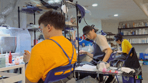 看到球鞋鞋跟logo磨掉了一半,绘画专业出身的小白会对着产品照片,用刀刻出相似的logo贴回去。同一时间,坐在他旁边的同事拿着极细的描边笔,给另一双鞋的鞋边凹槽填补金色。
