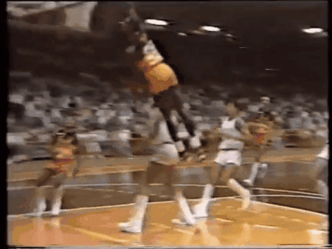 专业球员穿着皮革面的胶底鞋上场,球鞋和球员从此深度锁死,携手共创传奇。1985年,乔丹在意大利表演赛中大力扣篮,无意中击碎了篮板。