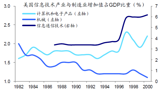 在政策红利下,美国企业成为了科研投入的中流砥柱,成功帮助美国实现产业结构转型。1980年到1995年期间,美国研发投入经费从698亿美元增长到1967亿美元,占GDP比重从2.44%上升到2.57%,期间科技产出高居全球首位。大量的研发投入在获得科研成果的同时促进了美国经济结构向科技的转型,1987年到2000年,美国信息通信技术产业增加值占GDP比重从3.4%增长到6.2%,而制造业增加值占GDP比重从1980年的20%下降到2000年的15.1%,作为信息产业的代表,计算机和电子产品产业增加值占GDP比重从1.8%增长到2.2%,而传统制造业如机械行业增加值占GDP比重从2.3%下降到1.1%。高科技产业逐渐取代传统制造业成为美国经济发展的主要推动力。