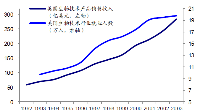 从美国经济结构转型的路径来看,总共可以分为三步。首先,关键技术的突破引发新一轮科技周期,并且开始了互联网的搭建以及相应的电子硬件需求量的暴增;随后,在互联网的推动下,亿生物医药行业为代表的新兴产业快速发展,截至2008年,美国拥有世界上约50%的生物技术公司和生物技术专利,美国生物技术产品销售额占全球市场的90%以上,高新技术产业逐渐成为美国经济发展的支柱。最后,高新技术向传统行业渗透,通过革新生产设备,改进管理模式,对传统行业进行改造。
