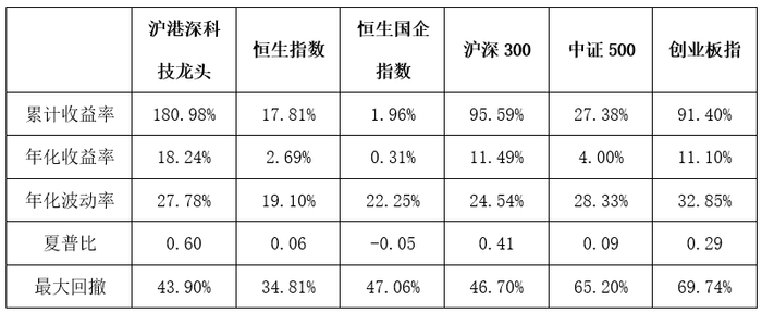 从历史表现来看,从基日(2014年11月14日)至2021年3月31日,沪港深科技龙头指数累计收益率为180.98%,年化收益率为18.24%,表现大幅优于同期沪深300、创业板指、恒生指数以及H股指数等市场主要宽基指数。该指数历史年化波动率为27.78%,比沪深300指数和恒生指数略大,与中证500接近,小于创业板指。综合波动性和收益率,沪港深科技龙头指数的历史夏普比为0.60,同样大幅优于市场主要宽基指数,其超越市场的表现十分显著。