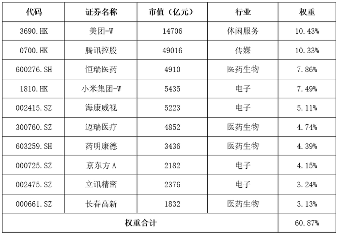就行业分布而言,沪港深科技龙头指数绝大部分权重聚焦电子、医药生物、计算机、通信等高成长性行业,前三大行业分别为电子(35.87%)、医药生物(30.42%)、传媒(11.66%),权重合计77.95%。前十大成份股既包含港股上市的美团、腾讯等互联网巨头,又包含恒瑞医药、迈瑞医疗等A股创新药龙头,此外还包含了海康威视、立讯精密、京东方等先进制造业优势企业。前十大公司在指数中权重占比合计达到60.87%,集中度较高,龙头效应突出。