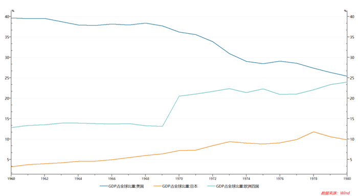 1973年中东石油输出国组织连续3次提高石油价格,发起“石油战”,美国进口原油价格从1973年的4.08美元/桶上升至1981年的37.1美元/桶。能源价格的大幅飙升对美国经济造成了严重冲击,70年代美国经济进入低增速、高通胀的滞胀泥潭。滞胀的经济环境使得美国传统制造业遭受巨大冲击,钢铁和汽车作为美国二战后经济发展的两大支柱产业,在此期间均出现不同程度衰退。美国钢铁业全球市场份额从1960年的26%下降到1980年的14.2%,汽车产业全球市场份额同期从48%大幅下降到了20.6%。与此同时,日本和欧盟的全球GDP占比分别提升了2%和6.3%。面对国内的困难局面和国际上的激烈竞争,美国政府决定,采取有效措施,发展科学技术,促进经济转型。