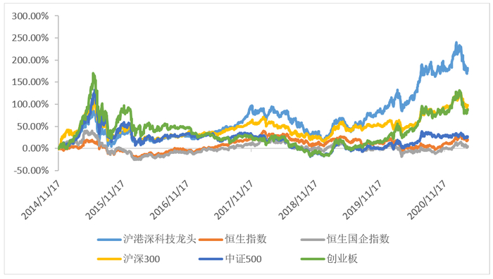 纵观A股市场,随着经济的发展,涌现出了一大批电子硬件与生物医药行业中的代表性企业,如立讯精密、京东方、恒瑞医药等。然而,由于上市规则等制度的限制,我国的互联网企业鲜有选择A股市场上市,反而青睐融资更为容易的香港市场,并孕育出了如腾讯、美团等为代表的全球互联网巨头。因此,只有将沪港深三地具有代表性的科技类公司含括在内的指数才能更好的代表中国未来科技转型的方向。目前来看,沪港深科技龙头指数汇聚了两岸三地一批科技行业上市龙头企业,可以被称为代表中国科技与未来经济转型方向的“中国版纳斯达克指数”。