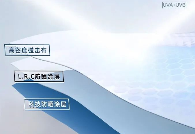 主要得益于它的三层防护:高密碰击布+LRC防晒层+科技防晒层