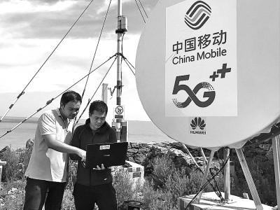 在江苏灌云县开山岛,中国移动工作人员测试5G信号。新华社发