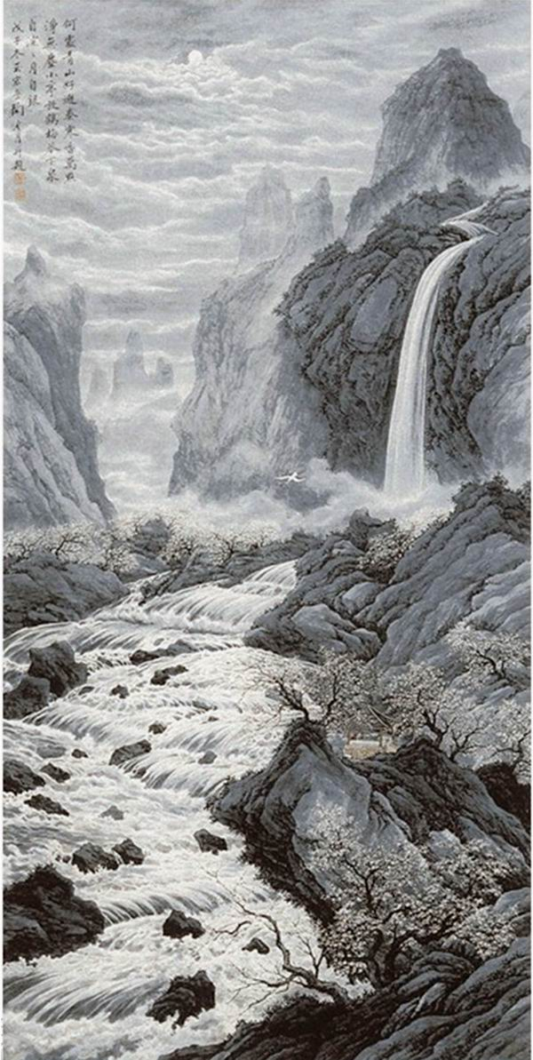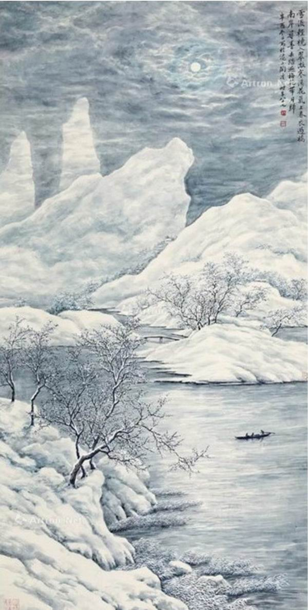 据此,经不断的摸索,他终于用传统没骨法在宣纸上绘出了明净的月,清澈的雪。