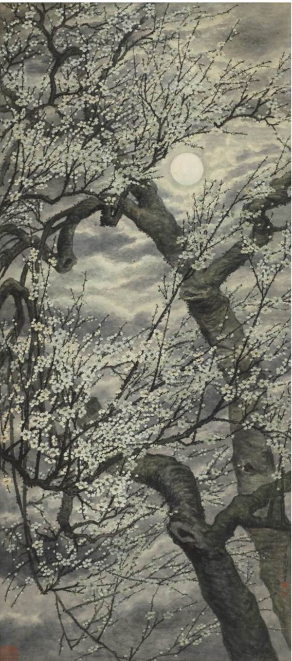 他又取石青、石绿等中国画材,用厚涂法、亮部塑造法等油画技法在绫上作《冷香夜月》。这些作品对剖析他的探索历迹,具有珍贵的研究价值。虽然这类掺入中国画意的尝试之作受到观者好评,但仍有西画的感觉,为此他没有继续下去。他要寻求的是既融入西画光影透视原理,又保持中国画属性的“新中国画”。