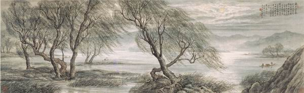 光风霁月,映照湖上,湖面波平如镜,倒影月色澄黄。小舟三两荡漾其间,坐者或仰观皓月,或鸣笛遣兴,亦见渔人撒网捕鱼于浅水。柳树依岸栽植,枝长叶满,清风拂掠,眼前一片繁绿招展飘扬,在静谧清幽的环境下,偶尔带来动感。陶冷月擅写月色山水,本幅无疑属最佳写照,虽曰融合西法,但内容诗意造境,与传统文人气息贯通,画面清朗柔美,令观者赏心悦目。