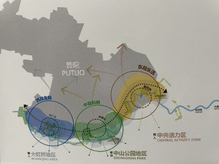 普陀区苏河沿岸立足规划引领,统筹开发的理念,坚持蓝绿为脉,腹地联动的原则,形成东中西三段功能特色:东侧乐活段以普陀坊更新提升为契机积极楔入中央活力区;中部科教段以华师大为核心跨河联动中山公园;西侧金融段以长风商务区和中和城为核心,共同打造科技金融集聚区,融入大虹桥地区。