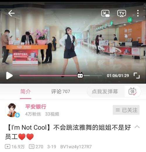 招行并非第一个让小姐姐跳舞的银行。3月19日,平安银行在其b站官方账号上,也推出了一个“不会跳泫雅舞的姐姐不是好员工”的视频,如今播放量接近17万,而该行的b站粉丝为4万,平时视频的播放量也在一万左右。