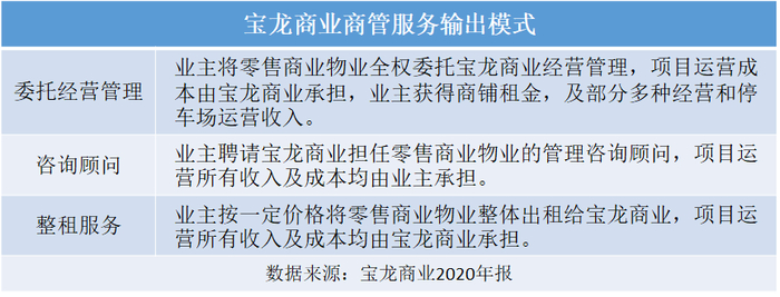 商管服务形式上,宝龙商业目前有三种,分别为委托经营管理、咨询顾问、整租。