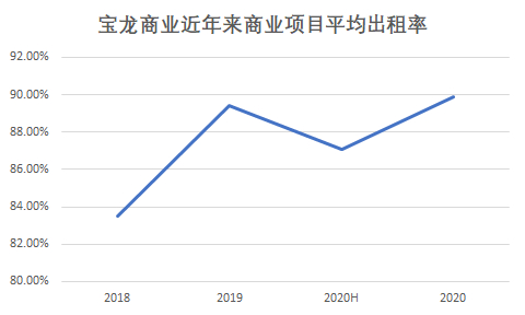 轻资产最为关键的运营能力上,租金收入、出租率等都是考量的重要指标,这方面宝龙商业去年表现实际上并不突出。2020年商业项目整体出租率为89%,虽然与前几年相比有所提升,但仍未达到90%以上,在竞争上并不占据优势。