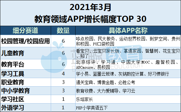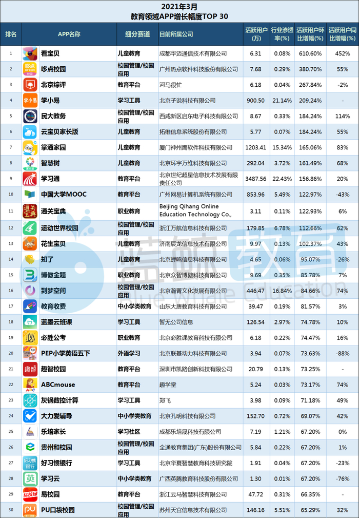 下面是2021年3月教育领域APP增长幅度排行榜TOP 30,分别有:“看宝贝”“哆点校园”“北京综评”“学小易”“民大教务”“云宝贝家长版”“掌通家园”“智慧树”“学习通”“中国大学MOOC”“通关宝典”“运动世界校园”“花生宝贝”“知了”“博傲金题”“到梦空间”“教育收费”“蓝墨云班课”“必胜公考”“PEP小学英语五下”“趣智校园”“ABCmouse”“灰锅数控计算”“大力爱辅导”“乐培家长”“贵州和校园”“好习惯银行”“学习云”“易校园”“PU口袋校园”。