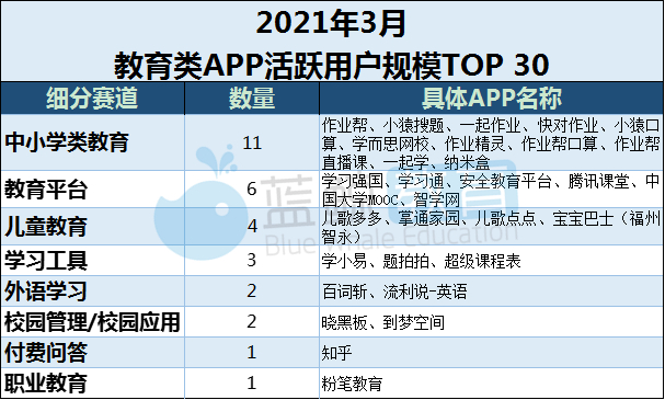 2021年Q1 教育领域用户规模TOP 30 APP分别有:“作业帮”“知乎”“学习强国”“学习通”“小猿搜题”“安全教育平台”“一起作业”“百词斩”“快对作业”“小猿口算”“儿歌多多”“掌通家园”“腾讯课堂”“学而思网校”“学小易”“中国大学MOOC”“儿歌点点”“粉笔教育”“作业精灵”“题拍拍”“作业帮口算”“流利说-英语”“晓黑板”“超级课程表”“作业帮直播课”“一起学”“宝宝巴士(福州智永)”“智学网”“纳米盒”“到梦空间”。