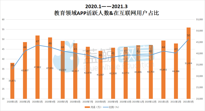 从2020年1月至2021年3月,教育领域APP整体呈现上涨趋势,用户规模从去年年初的35871万用户,经历第一季度的暴涨达到了47902万,二季度开始停下暴涨的步伐,趋势呈现回落,到2020年8月末,用户规模达41167万,随后数月处于发展的平稳阶段,直到2021年3月末数据达到顶峰,教育领域或活跃人数突破5亿,月活跃人数高达51424万。另外,教育领域的用户规模占比也突破新高,从2020年1月的35%提升至50%。
