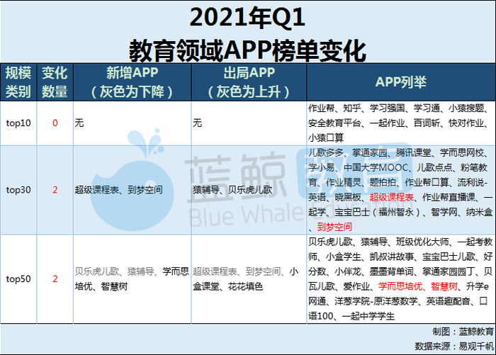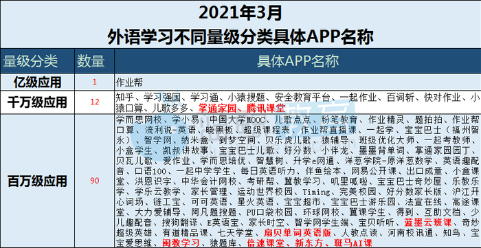 为了更好的梳理2021年第一季度教育领域具体的APP数据变化,蓝鲸教育智库选取了2020年12月末和2021年3月末,教育领域APP的具体榜单变化,下图是“2021年第一季度教育领域APP榜单变化”:标灰色的APP表示从上一级别甩出到下一级别或者从下一级别进入上一级别,并不算作该级别新增APP;标红的为2021年3月各大TOP排行榜等级上升的APP: