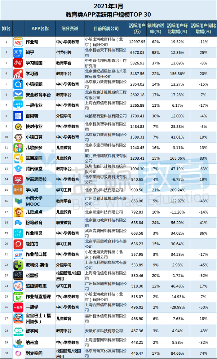 下面是2021年第一季度末,教育领域APP活跃用户规模TOP 30,包含APP所属细分赛道、所属公司、环比同比增幅等维度: