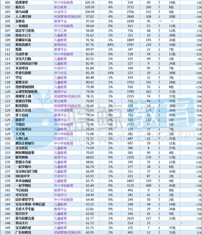从用户规模TOP 150榜单,位次上升明显的APP有:“运动世界校园”上升了53名,“智慧树”上升49名,“蓝墨云班课”上升43名,“掌上校园”上升39名,“微课掌上通”上升37名,“PU口袋校园”上升37名,“大力爱辅导”上升36名,“人教口语”上升35名……