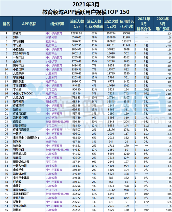 下面是2021年3月末前150家在线教育活跃APP的详细排名,排名按照用户规模,包括活跃人数、启动次数及使用时长等维度数据(“-”代表没有相关数据),供大家查阅: