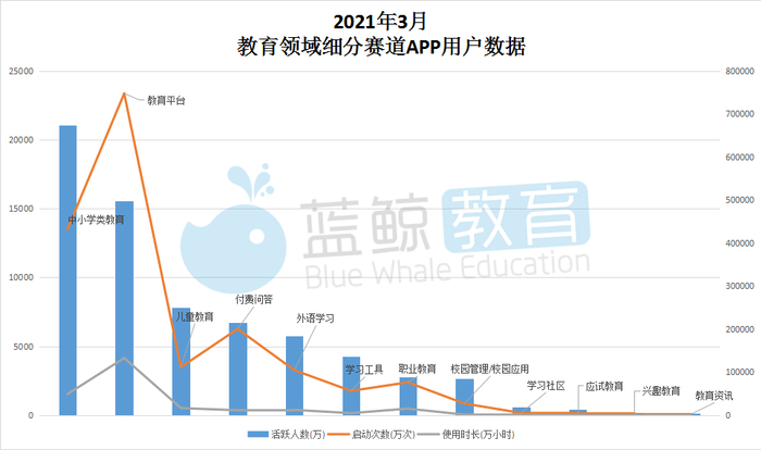 下面是蓝鲸教育智库为大家盘点2020年年初至2021年3月,教育领域APP活跃人数与全网占比: