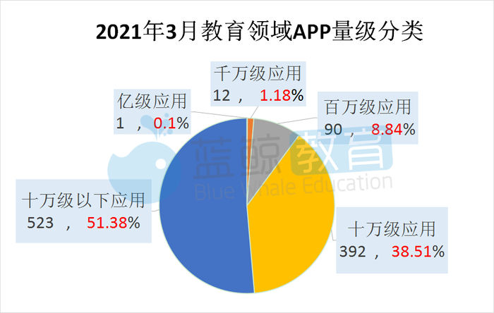 下面,蓝鲸教育智库把1018家教育APP,按照用户规模,分别以1亿、1000万、100万、10万为界限做量级分类,得到的结果如下图所示:
