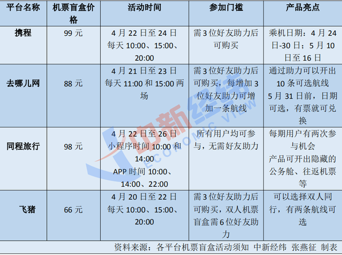 4月20日,飞猪推出66元机票盲盒;21日,去哪儿88元旅行盲盒上线;22日,携程99元“隐藏款”机票类盲盒也开售……五一小长假临近,各大在线旅行平台纷纷推出“机票盲盒”。