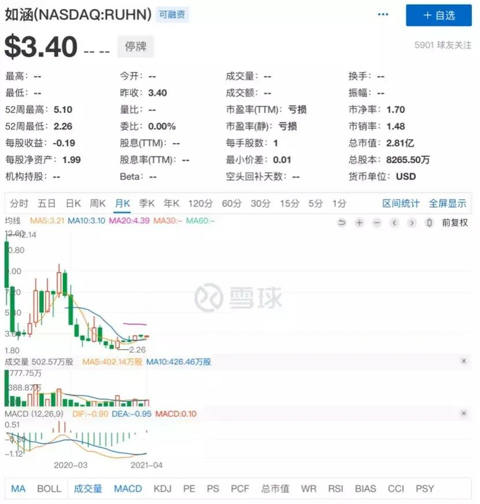 目前,如涵已经在纳斯达克停牌,4月19日为其停牌前最后一个交易日,收报3.40美元,总市值为2.81亿美元。