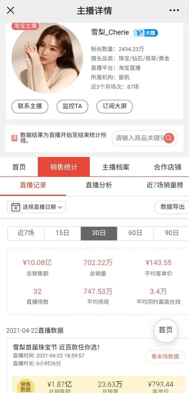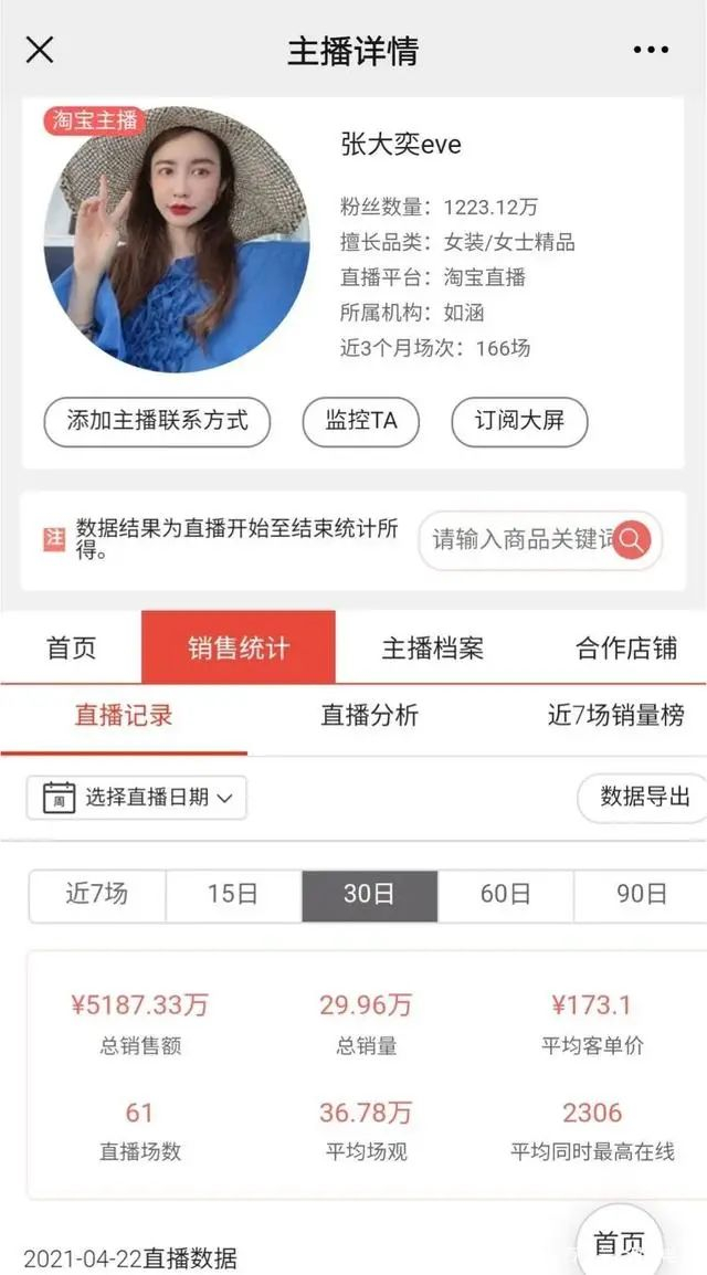 做为一个店铺粉丝1200多万的大主播,平均带货只有20万左右,看起来有点奇怪。实际上,张大奕的直播间,她自己很少直播,只有大促时,才参与直播。
