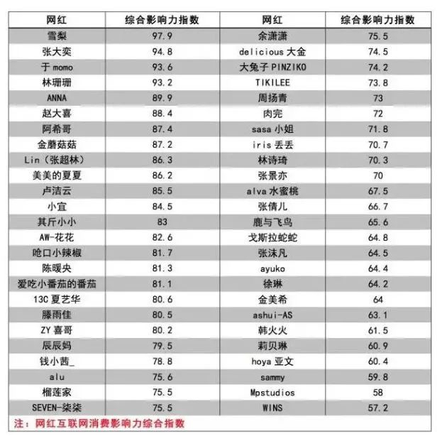 阿里巴巴发布的2017《网红消费影响力指数综合排名》