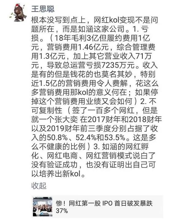 这钱都亏到哪里了?早在如涵上市前,王思聪就点破了如涵商业模式存在的三点问题: