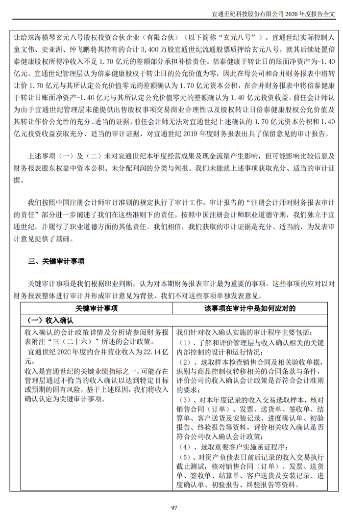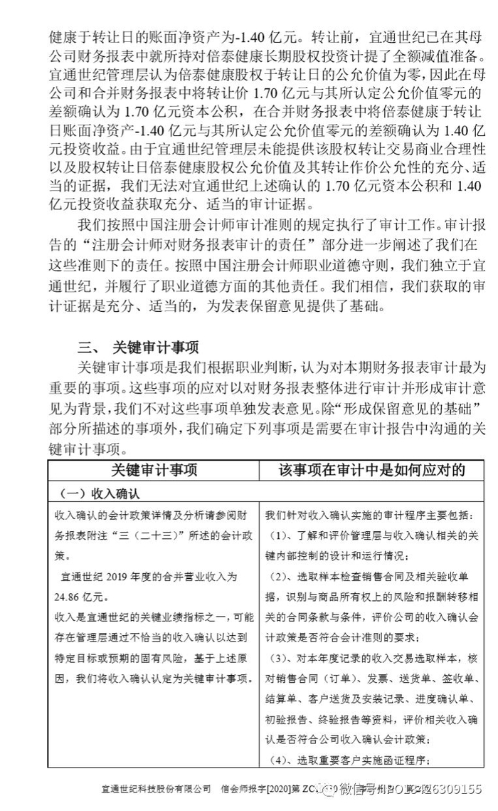 如财务报表附注六(一)所述,宜通世纪于2019 年 12月 27 日(转让日)将其持有的倍泰健康 100%股权作价 1.7 亿元转让给珠海横琴玄元八号股权投资合伙企业(有限合伙)(以下简称“玄元八号”)。2019 年 12 月 20 日,宜通世纪实际控制人童文伟、史亚洲、钟飞鹏将其持有的合计 3,400 万股宜通世纪流通股票质押给玄元八号,就其后续处置倍泰健康股权所得净收入不足1.70 亿元的差额部分承担补偿责任。倍泰健康于转让日的账面净资产为-1.40 亿元。转让前,宜通世纪已在其母公司财务报表中就所持对倍泰健康长期股权投资计提了全额减值准备。宜通世纪管理层认为倍泰健康股权于转让日的公允价值为零,因此在母公司和合并财务报表中将转让价 1.70 亿元与其所认定公允价值零元的差额确认为 1.70 亿元资本公积,在合并财务报表中将倍泰健康于转让日账面净资产-1.40 亿元与其所认定公允价值零元的差额确认为 1.40 亿元投资收益。由于宜通世纪管理层未能提供该股权转让交易商业合理性以及股权转让日倍泰健康股权公允价值及其转让作价公允性的充分、适当的证据,我们无法对宜通世纪上述确认的 1.70 亿元资本公积和 1.40 亿元投资收益获取充分、适当的审计证据。