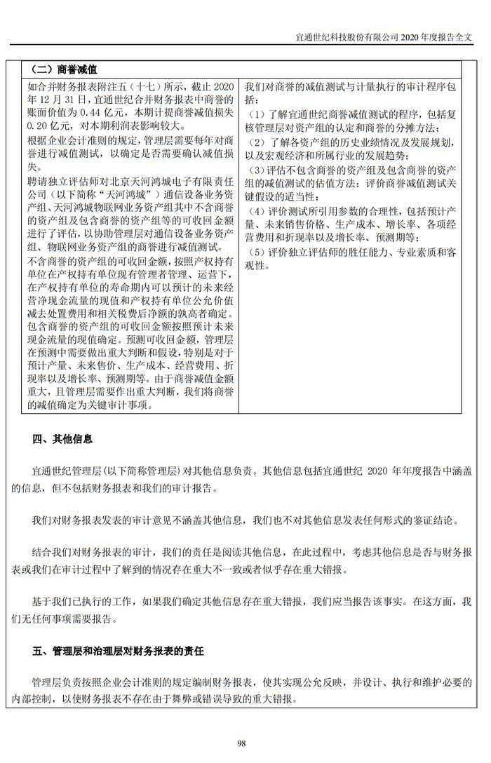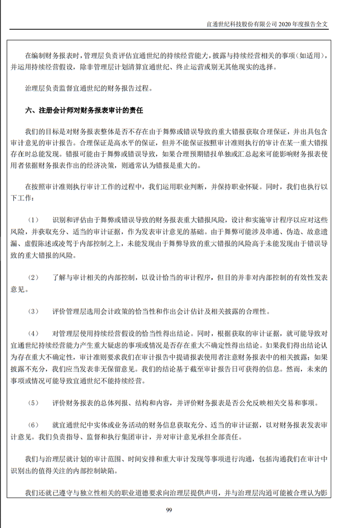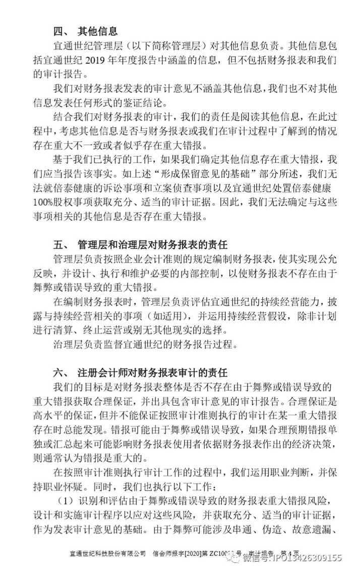 由于无法对宜通世纪全资子公司深圳市倍泰健康测量分析技术有限公司(以下简称“倍泰健康”)的诉讼事项和立案侦查事项(具体事项详见财务报表附注十四(七)1、2)获取充分、适当的审计证据,我们对宜通世纪 2018 年度财务报表出具了保留意见的审计报告。如财务报表附注六(一)所述,宜通世纪于 2019年12 月 27 日丧失对倍泰健康的控制权,自该日起倍泰健康不再纳入宜通世纪合并财务报表范围。截止审计报告日,我们仍无法对上述倍泰健康诉讼事项和立案侦查事项获取充分、适当的审计证据,因此无法确定上述事项对宜通世纪本期财务报表及比较信息可能产生的影响。