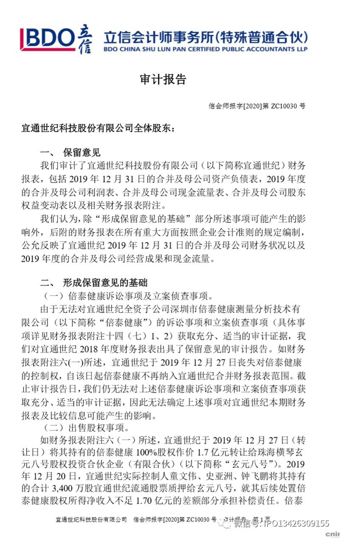 立信会计师事务所(特殊普通合伙)对倍泰健康2019 年前三季度的财务报表进行了审计,并于2019年12月9日出具了信会师报字[2019]第ZC10559号《审计报告》,审计意见类型为无法表示意见。无法表示意见主要基于:倍泰健康目前涉及诉讼金额 2.24 亿元,其中 1.73 亿元诉讼涉及的或有赔偿金额尚未估计入账。宜通世纪科技股份有限公司于 2018年 7 月收到广州市公安局天河分局出具的《立案告知书》,倍泰健康原董事长方炎林及原总经理李询涉嫌犯罪且已被立案侦查,目前尚未收到最终侦查结果,无法判断上述案件可能产生的影响。
