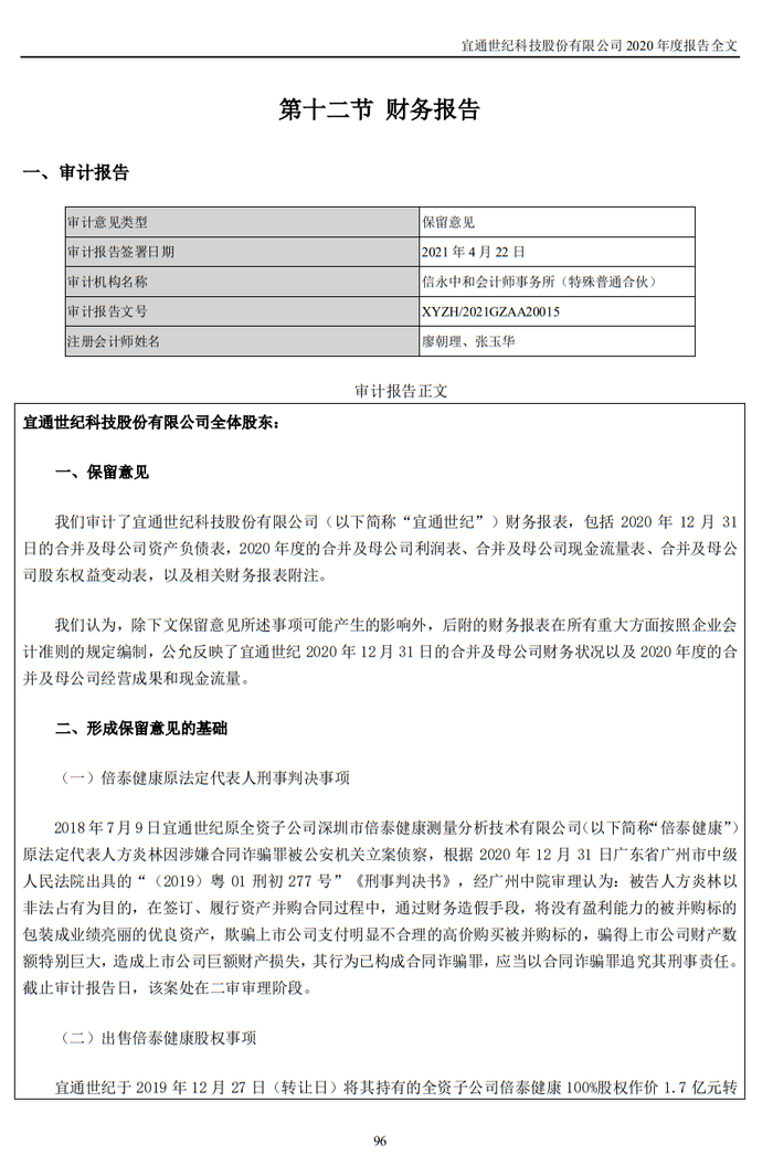 立信会计师事务所(特殊普通合伙)对倍泰健康2018 年度的财务报表进行了审计,并于 2019 年 4 月 23 日出具了信会师报字[2019]第ZC10325 号《审计报告》,审计意见类型为无法表示意见。无法表示意见主要基于:倍泰健康涉及诉讼金额 1.88 亿元,其中 1.40 亿元诉讼涉及的或有赔偿金额尚未估计入账。宜通世纪科技股份有限公司于 2018 年 7 月收到广州市公安局天河分局出具的《立案告知书》,倍泰健康原董事长方炎林及原总经理李询涉嫌犯罪且已被立案侦查,目前尚未收到最终侦查结果,无法判断上述案件可能产生的影响。