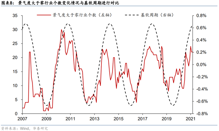 在华泰金工中观基本面轮动系列报告《行业配置策略:景气度视角》(2020-11-05)中,我们结合财务报表、业绩快报、业绩预告、一致预期等多个维度数据,构建了17个景气度指标来对各行业景气状态进行月度打分(该指标景气度向好打1分,恶化打-1分,无信号打0分)。综合得分越高的行业越景气,全市场综合景气度大于零的行业个数越多,意味着全市场景气度越高。
