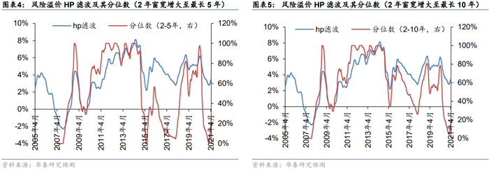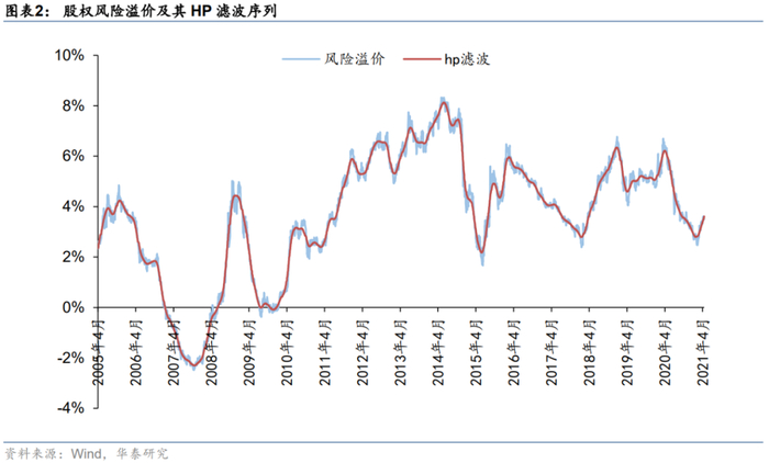 然而直接采用股权风险溢价的日度数据进行判断时,会面临噪声较大的问题。因此我们首先需要对股权风险溢价的日度数据进行一定程度的平滑处理,同时希望处理后的序列能跟原始序列在时间维度上大致保持一致的走势,以提升拐点判断的择时准确性。因此我们引入HP滤波对日频的股权风险溢价序列先进行平滑处理。