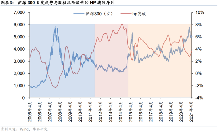 从上图可以看出,红线HP滤波序列相比于蓝线原始的风险溢价序列,基本没有日频数据的“毛刺”状,整体曲线较为平滑。观察风险溢价所处的数据区间,在2005-2011年期间,当风险溢价高于4%时,往往意味着股市将有较好的表现;然而在2012初-2014年底,风险溢价持续走高,最高接近8%,期间沪深300指数表现不佳;从2015年开始,每当风险溢价接近6%时,股市都将触底反弹,而当风险溢价低于3%时,股市往往会拐头向下。这说明随着时间的变化市场不断演变发展,股权风险溢价的绝对数值高低对股市拐点的判断作用也在发生变化。
