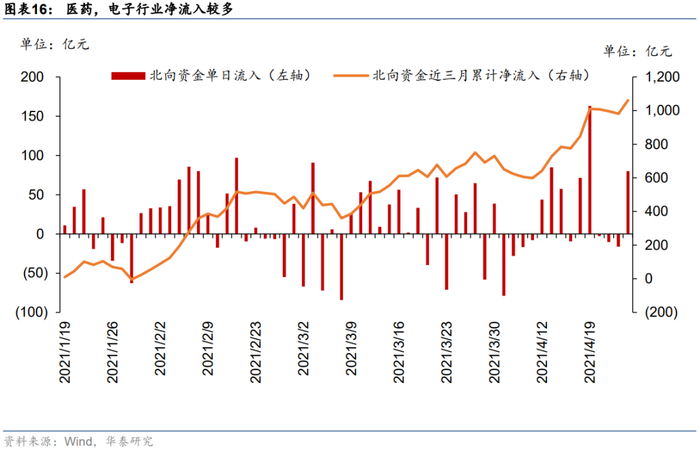 上周北向资金大幅净流入,单周总计净流入214亿元,其中上周一单日净流入163亿元。近三个月(60个交易日)累计净流入1060亿元。