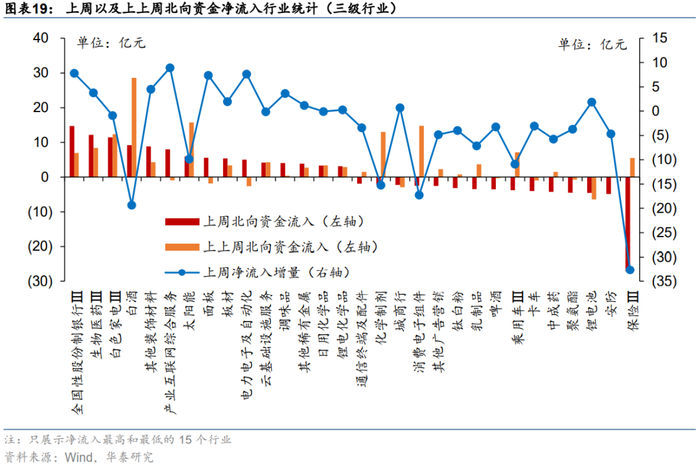 从行业层面来看,上周加仓最多的行业是计算机(14.82亿元)、家电(13.35亿元)、医药(11.53亿元),减仓最多的行业是非银行金融(28.83亿元)、汽车(6.41亿元)、电力及公用事业(2.95亿元)。深入到子行业视角来看,全国性股份制银行Ⅱ、生物医药Ⅱ、白色家电Ⅱ加仓最多,中药生产、新能源动力系统、保险Ⅱ减仓最多。