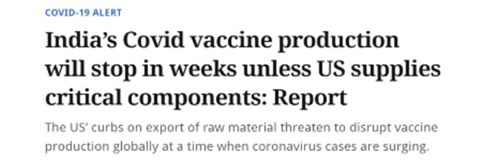印度最大的疫苗生产商印度血清研究所当前每月最多生产7000万剂新冠疫苗,光是满足新增疫苗接种人群的需求,也许就需要好几个月的时间。