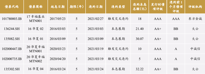 2021年2月27日,华夏幸福的17幸福基业MTN001中期票据触发交叉违约。3月份,16华夏02、16华夏01、20华夏幸福MTN001、20华夏幸福MTN002、16华夏04相继违约。截至4月12日,华夏幸福累计违约本金111亿元。