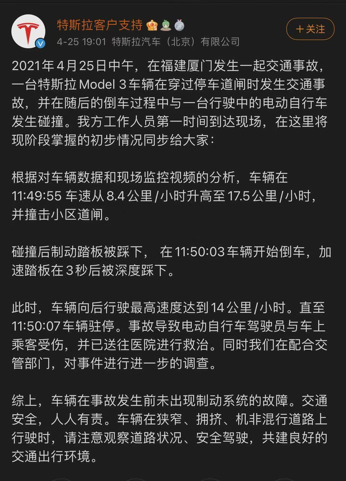 4月25日晚间,@特斯拉客户支持 对厦门车祸事件作出回应称未出现制动系统故障。