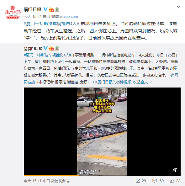 特斯拉厦门又出事,倒车撞倒4人,一3岁儿童骨折!警方通报,特斯拉回应了