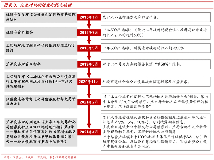 (6)2021年2月,《公司债券发行与交易管理办法》删去对地方政府融资平台的绝对限制性文字。证监会完善修订了《公司债券发行与交易管理办法》,将“本办法规定的发行人不包括地方政府融资平台”删去,第七十七条规定“发行公司债券,应当符合地方政府性债务管理的相关规定,不得新增政府债务”,引发市场对于逐步放开地方政府融资平台的猜想。