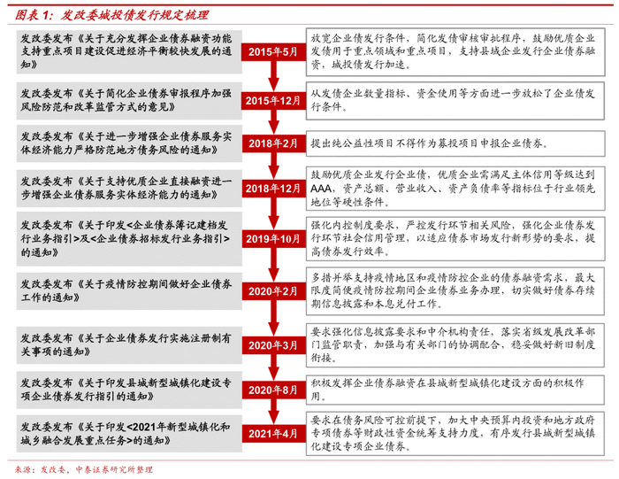 (12)2021年4月,发改委进一步推进县城新型城镇化建设专项企业债。发改委发布《关于印发<2021年新型城镇化和城乡融合发展重点任务>的通知》(发改规划〔2021〕493号),要求在债务风险可控前提下,加大中央预算内投资和地方政府专项债券等财政性资金统筹支持力度,有序发行县城新型城镇化建设专项企业债券。