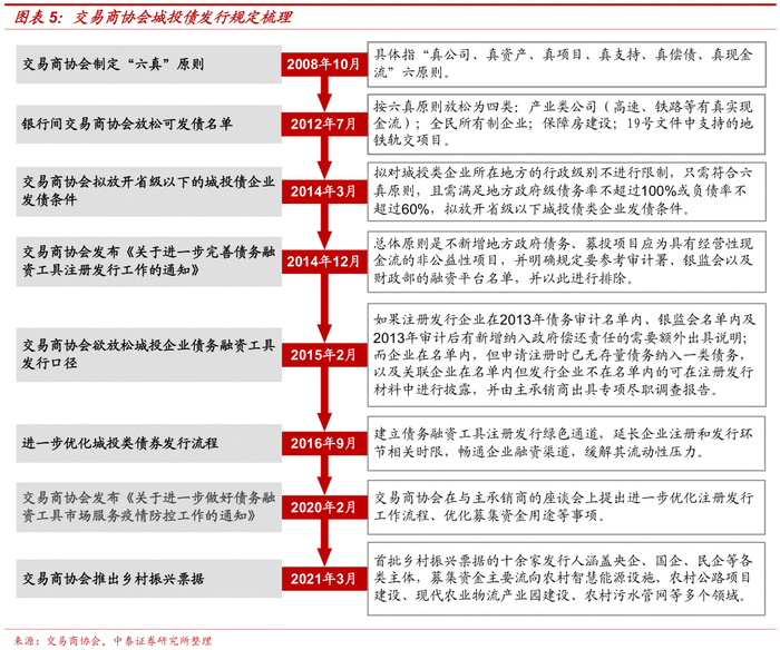 (1)2008年10月,交易商协会制定“六真”原则。具体指“真公司、真资产、真项目、真支持、真偿债、真现金流”六原则,即:明确要求申请企业不得为“空壳”公司,需内控完善,业务经营和公司财务具有独立性;公司资产必须存在能产生现金流和利润并保证偿债的经营性资产,不能全部为公益性资产;必须是公司或下属子公司正常经营的项目,要避免为融资而将项目主业临时并入的情况;政府具有明确的支持措施,且措施落实到位;要有明确、可信的偿债计划,具体体现为非经营性收入是否超过30%,地方政府债务率是否低于100%;公司必须有稳定、真实的现金流。