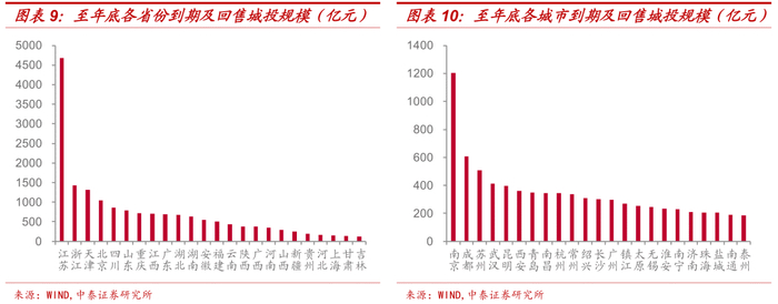 从省和直辖市来看,4月24日至年底之间到期及回售的城投债中,占比最高的省或直辖市分别为江苏、浙江、天津、北京,均在1000亿元以上,其中江苏和浙江的规模分别达4685.54亿元和1422.98亿元。从城市来看,未来6个月内到期及回售的城投债规模达200亿元以上的城市共21个[8],其中南京、成都、苏州、武汉债务规模较大,分别达1202.98亿元、606.70亿元、509.51亿元、413.60亿元。